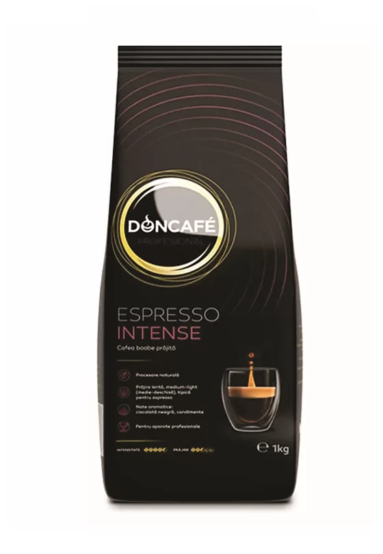 Doncafè Espresso Intense selecția perfectă de boabe pentru o cafea tare, un blend unic de cafea de culoare brună, caracteristică prăjirii foarte lente, este folosit pentru obținerea unui gust autentic de cafea espresso, dar și a unei arome puternice.